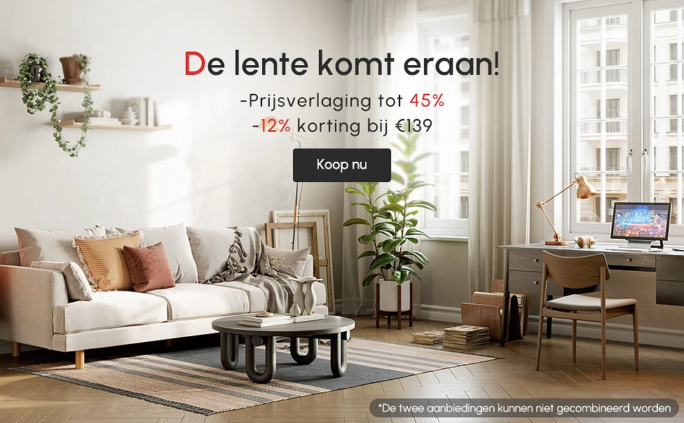 Zachte neutrale tinten, warm hout en zachte groenplanten komen samen rond een lichtgrijze hoekbank, die een ontspannen woonkamer creëert, gemaakt voor trage ochtenden, rustige avonden en dagelijks comfort.