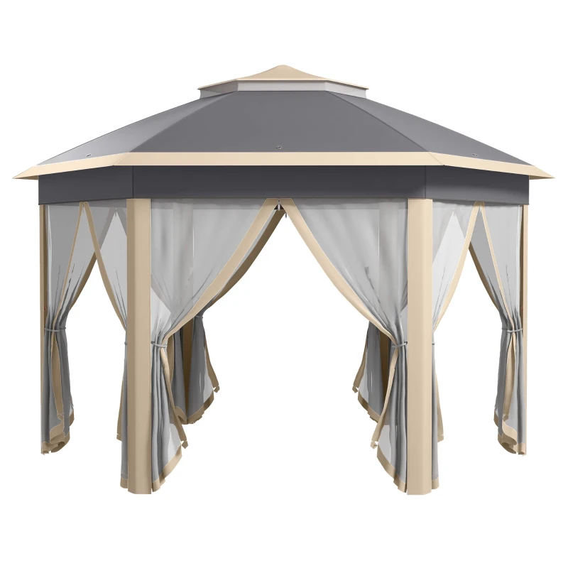 Outsunny tuinpaviljoen opvouwbaar tuinhuisje 4 x 4 m pop-up tent partytent incl. draagtas 6 zijpanelen dubbel dak zeshoekig beige + kaki